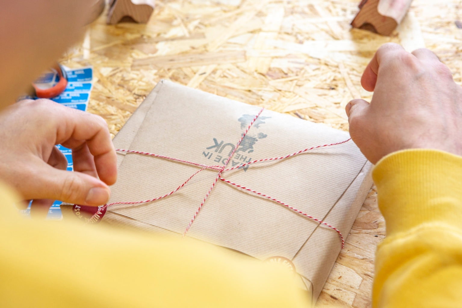 We carefully wrap all our postal hampers by hand, using beautiful, traditional packaging, parcel paper, twine and ink stamps.