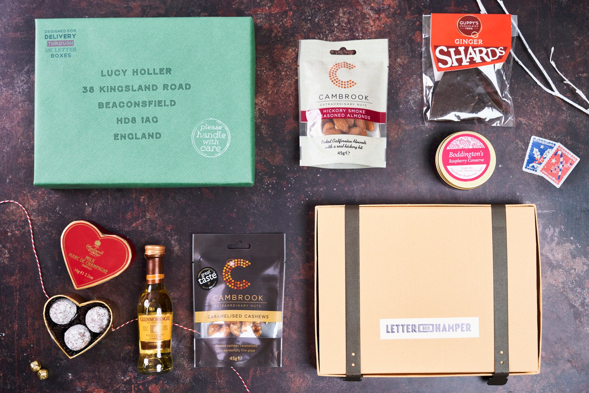 This special edition Christmas Letter Box Hamper includes Charbonnel & Walker sea salt caramel truffles, Chocolate Shards with warming ginger spice, Cambrook's Roasted Festive Nuts, Plymouth Gin and Boddington's Raspberry Jam.
