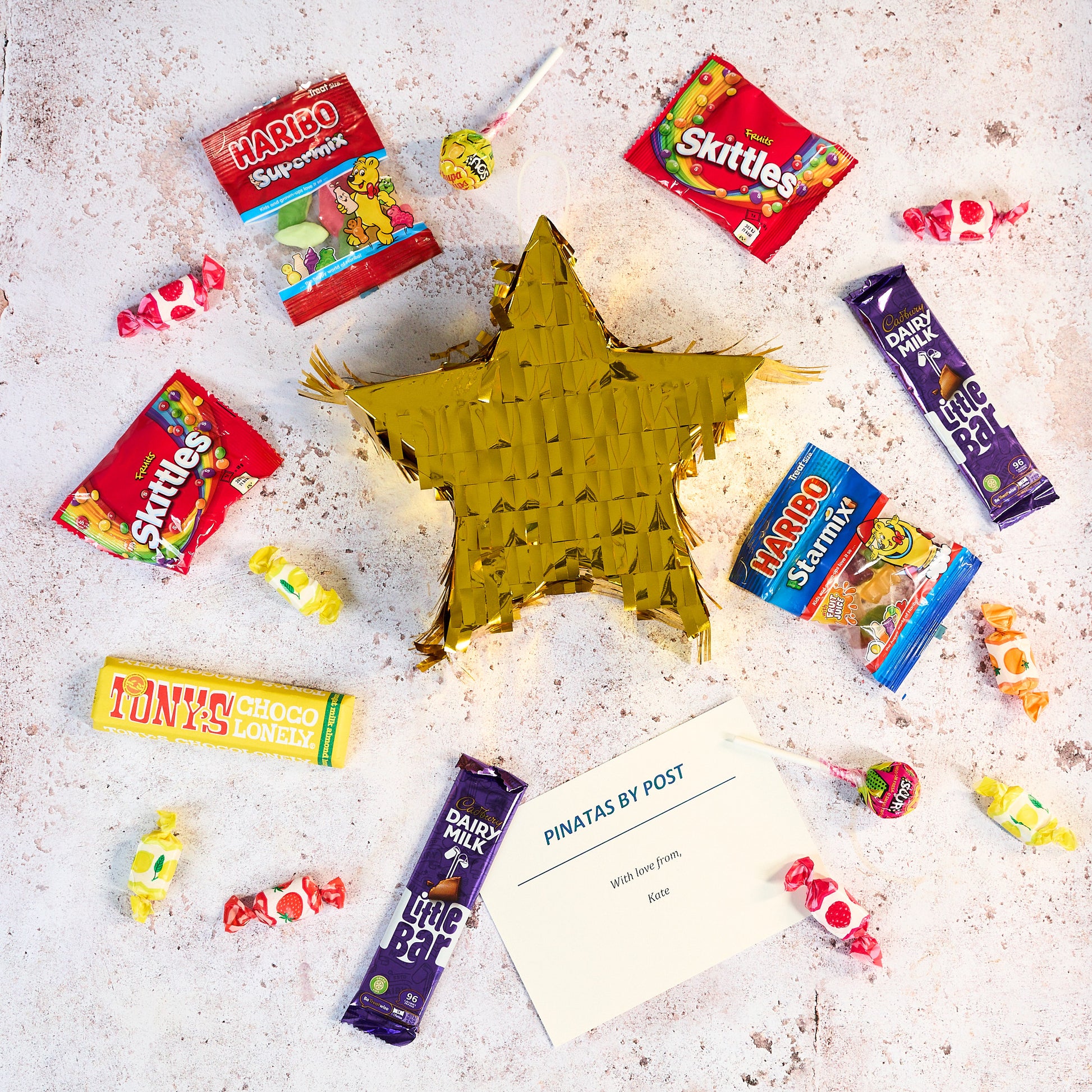 This Golden Star design Piñata is stuffed with classic North American and European sweets and candy, including Skittles, Starburst, Haribo, Moam & French Bonbons.