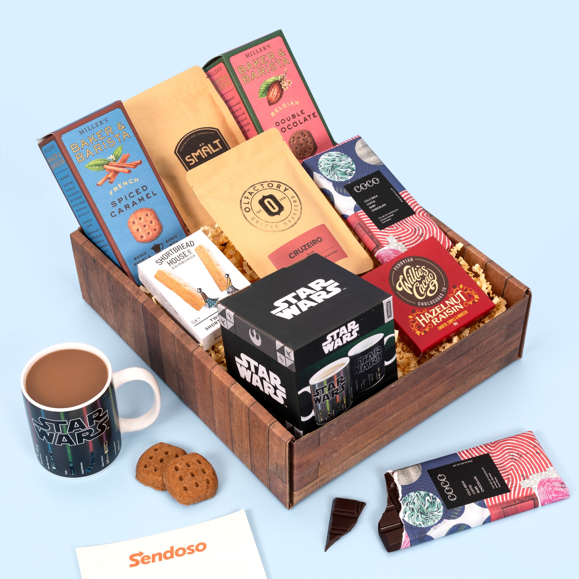 This luxury gift box includes a genuine Star Wars heat changing Lightsaber mug, which lights up lightsabers on the side when filled with hot beverages. To go with the mug, freshly ground coffee, hot chocolate, french spiced caramel biscuits, Belgian chocolate biscuits and Willie's hazelnut & Raisin dark chocolate.