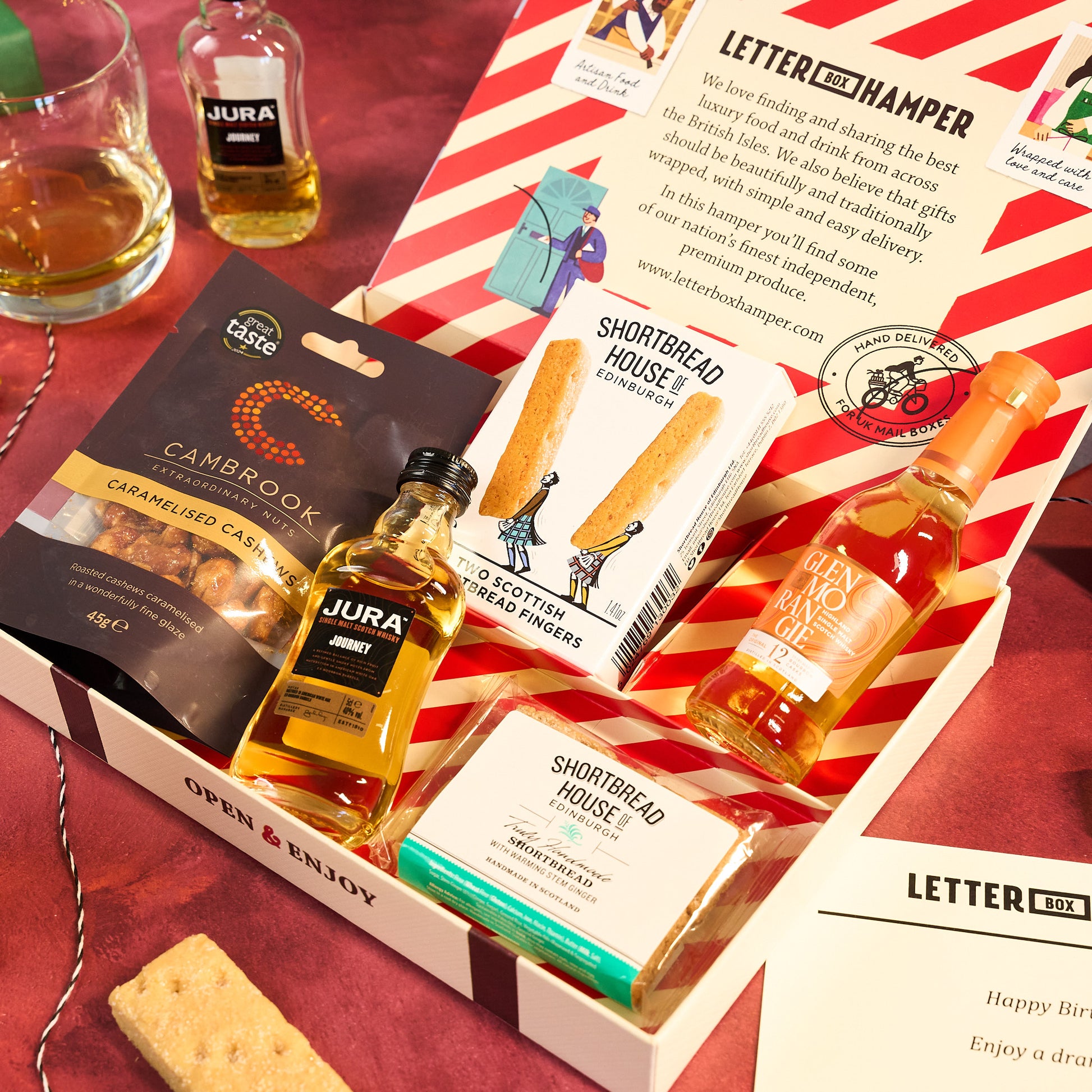 Beautifully wrapped in traditional parcel paper, with twine and ink stamps, the Whisky Lovers Letter Box Hamper includes two of Scotland's finest single malt scotch whiskies - Macallan and Jura - as well as shortbread, biscuits and sweet and salted nuts.